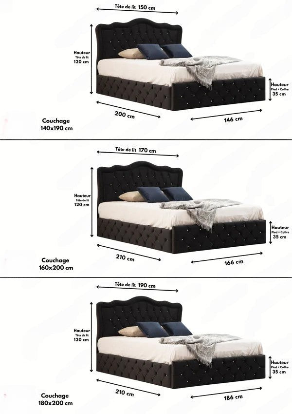 Profitez d’un confort absolu avec lecadre de lit capitonné 2 places Venise. De couleur noire, votrecadre de lit capitonnéconfère à votre chambre à coucher du prestige et de l’élégance. Votre cadre de lit vous assure une commodité d’utilisation pendant plusieurs années. Grâce à ses trois dimensions 140x190 160x200 et 180x200,votre cadre de lit 2 placesvous procure l’espace suffisant pour passer une nuit paisible et agréable. Votre cadre de lit en velours peut être livréavec ou sans sommier, suivant l’option que vous choisissez.