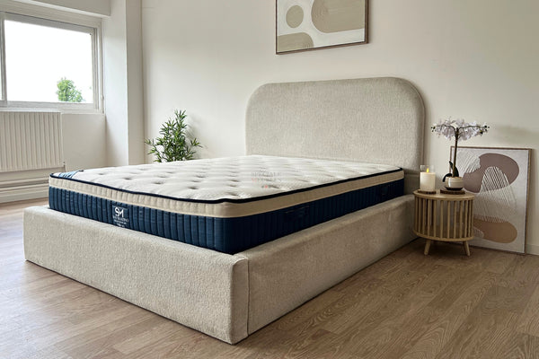 ✓ Structure & Matière : Cadre et tête de lit en panneau aggloméré, mousse HR, tissu chenille