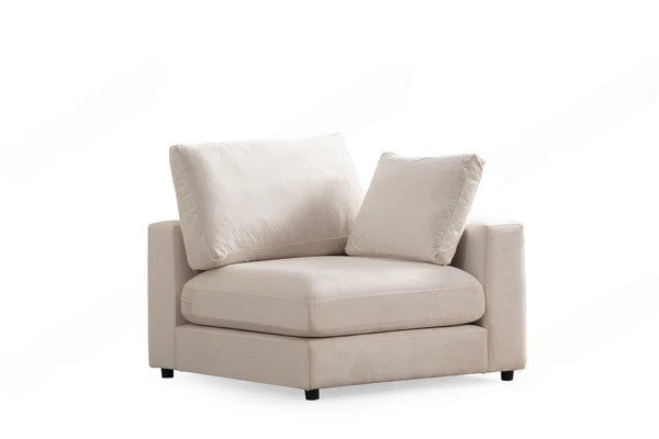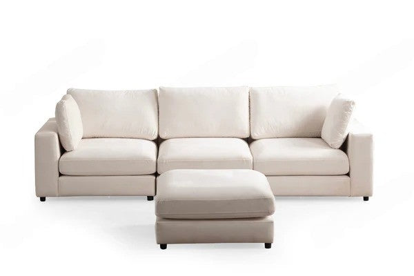 Le canapé Julia modulable 3 + 1 pouf apportera une nouvelle ambiance à votre intérieur, une touche harmonieuse et délicate grâce à son revêtement en velours blanc cassé. Sa mousse Ultra confort vous assure une sensation de douceur optimale.